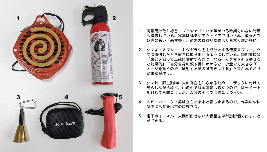 ▲ 写真9 クマ対策のために現地に持っていくもの