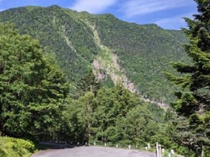 南アルプス・仙丈ヶ岳の登山口に位置する大平山荘から西側の斜面を見上げると,稜線(馬ノ背尾根)付近から林道の近くまで,帯状に立木がなくなっているのが見えます(写真1)。ところどころ白っぽく土が見えているところもあります。