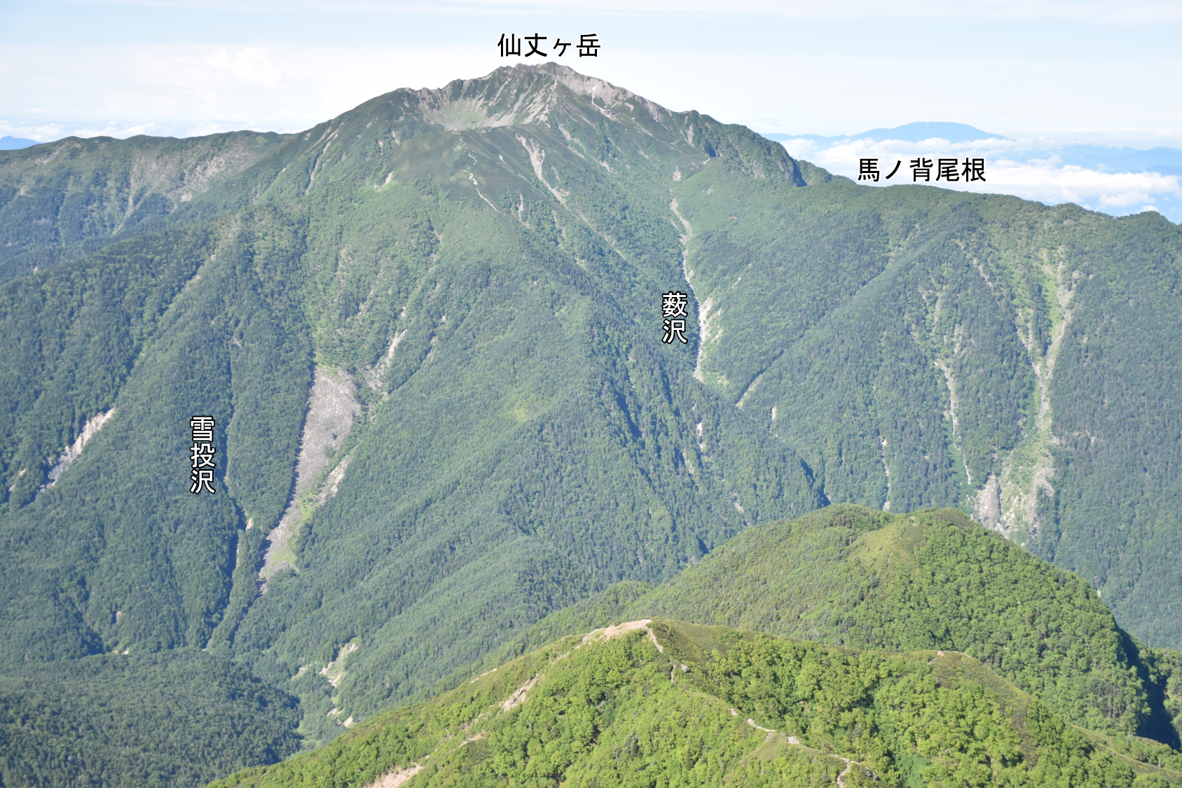 北沢峠を越えて,南アルプス林道を山梨県側に歩いていくと,正面(南西方向)に小仙丈ヶ岳が見えてきます。こちらの斜面でも,帯状に立木がなくなっているところがあります(写真2)。これらはどちらも,雪崩が流下した痕跡です。甲斐駒ヶ岳の山頂からは,2つの雪崩の痕跡を一望することができます(写真3)。