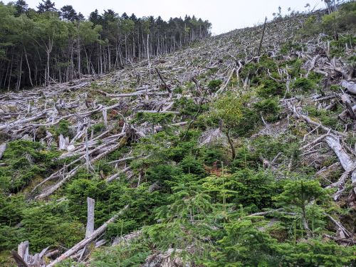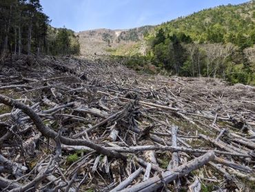 ▲ 写真3 甲斐駒ヶ岳の山頂から見た仙丈ヶ岳(2021/7/18撮影,写真提供 金城学院大学薬学部 吉田耕治准教授)雪崩が起きたのは,仙丈ヶ岳から北に続く馬ノ背尾根の北東斜面(薮沢)と,小仙丈ヶ岳の北東斜面(雪投沢)です(図1)。発生時期は,衛星画像やスキーで訪れた人の写真等から2017年2月中旬から下旬とみられます。この雪崩によって,亜高山帯林(シラビソやトウヒ,カラマツ,ダケカンバ等)のまとまった倒木が発生し(写真4,5),藪沢では倒木の一部が流路に流れ込みました。2017年の雪崩による森林被害面積はそれぞれ約4.1 ha(藪沢),約3.5 ha(雪投沢)とみられます。