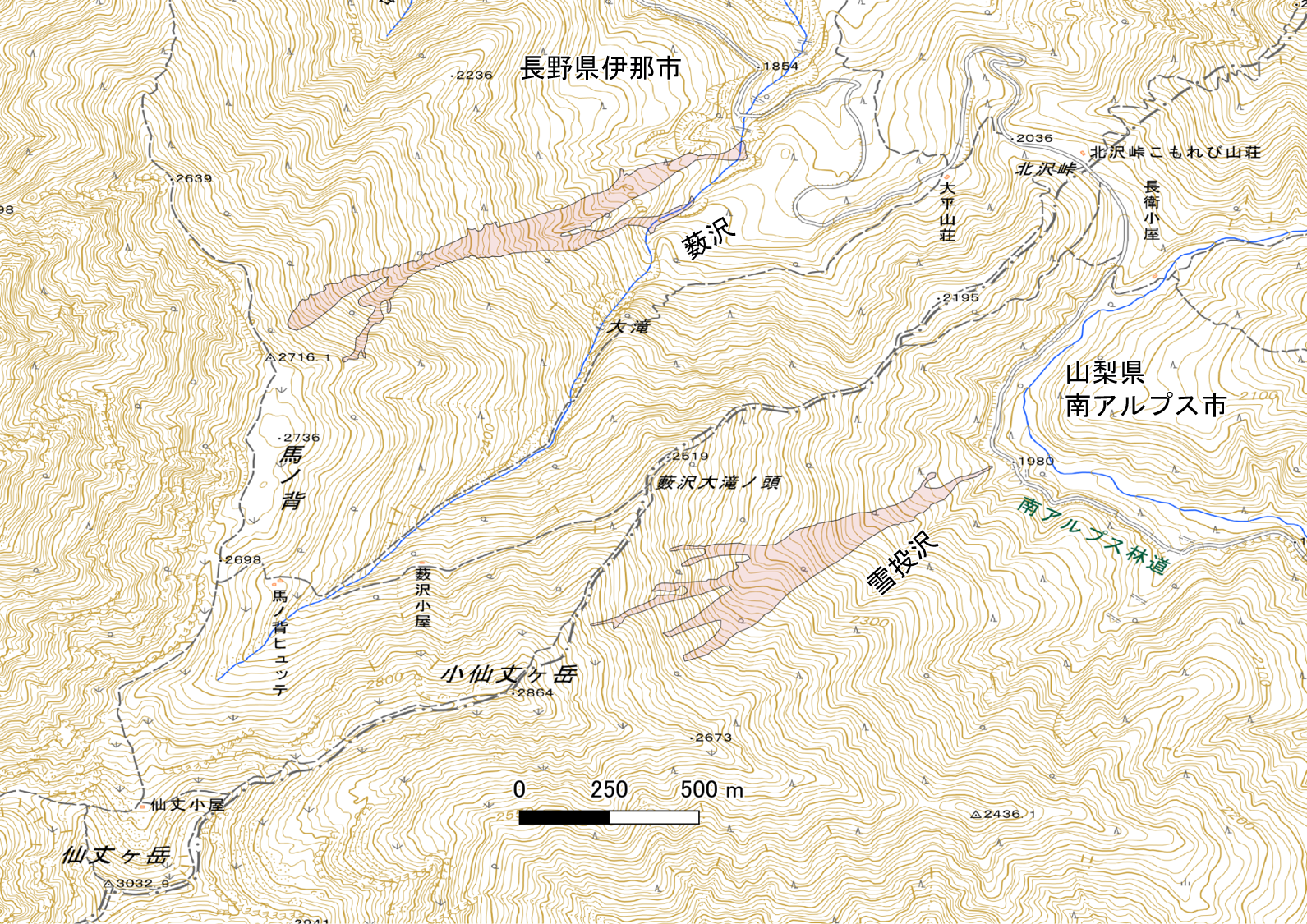 ▲ 図1 雪崩流下範囲(地理院地図に加筆)