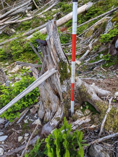 ◀ 写真6 幹折れしたシラビソの位置座標の記録と高さの計測(2021/7/16)