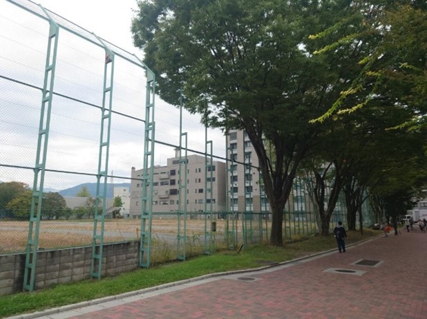 職員駐車場だった頃 グラウンドの面影を残す高いフェンス