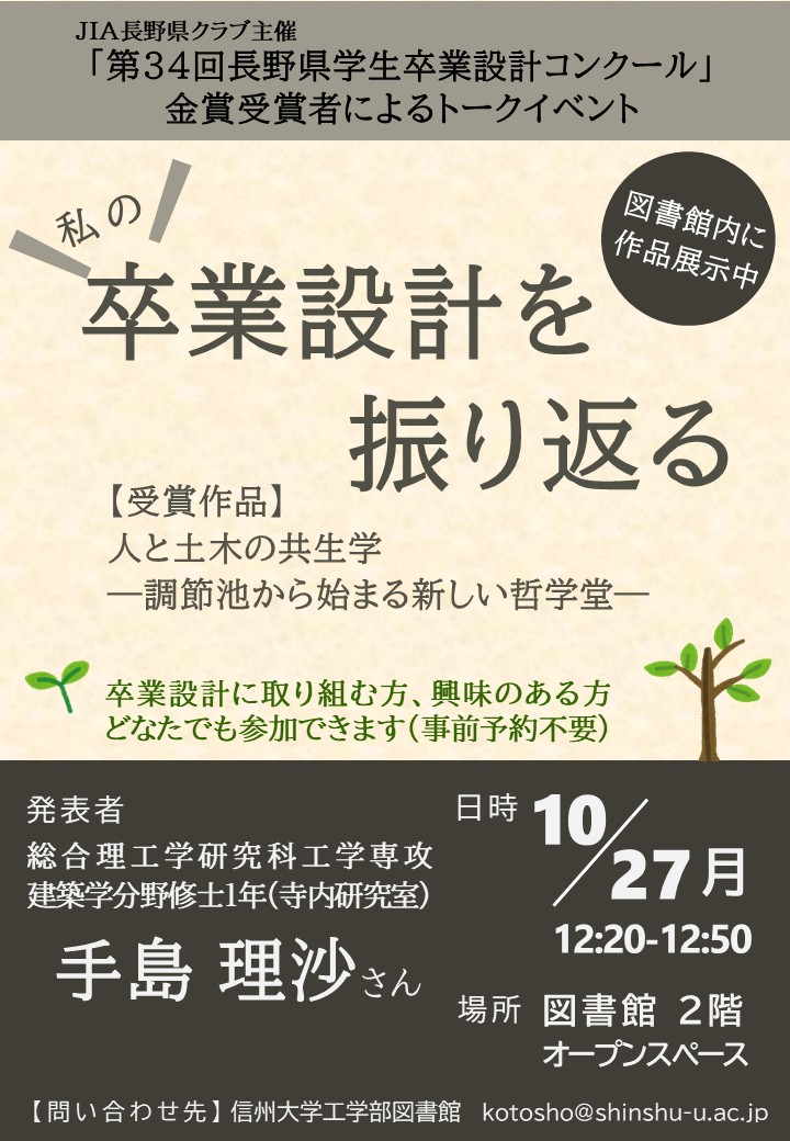 「私の卒業設計を振り返る」修士学生によるトークイベント開催(10月27日) 2025.10.10 工学部図書館 JIA長野県クラブ主催「第34回長野県学生卒業設計コンクール」にて金賞を受賞した学生によるトークイベントを開催します。これから卒業設計に取り組む方、興味のある方、ぜひご参加ください。受賞作品も図書館内で展示中です。 *** テーマ:「私の卒業設計を振り返る」 日時: 10月27日(月)12:20~12:50場所: 工学部図書館2階 オープンスペース発表者:手島 理沙さん 建築学分野修士1年(寺内研究室) 【お問合せ先】 工学部図書館 kotosho@shinshu-u.ac.jp 前へ 一覧にもどる