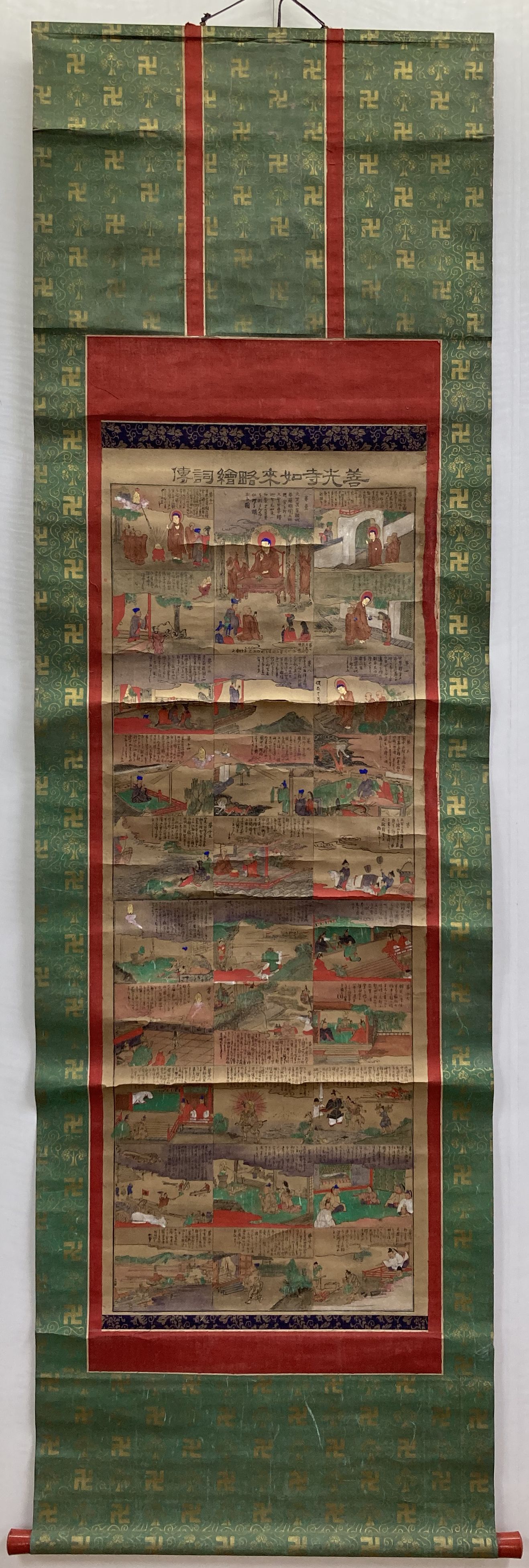 善光寺如来の「御影」や「善光寺縁起」は、絵画化され掛軸の体裁をとるものがあります。掛軸の大画面に、如来の「御影」や、三国を伝来し善光寺の本尊となるまでの主要な場面を描くことにより、一度に多くの人々が鑑賞できるという利点がありました。