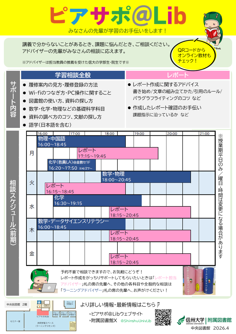 講義や課題の相談だけでなく、Wi-Fiのつなぎ方やeALPSからの課題提出方法など、ささいなことでもお気軽にご相談ください。
