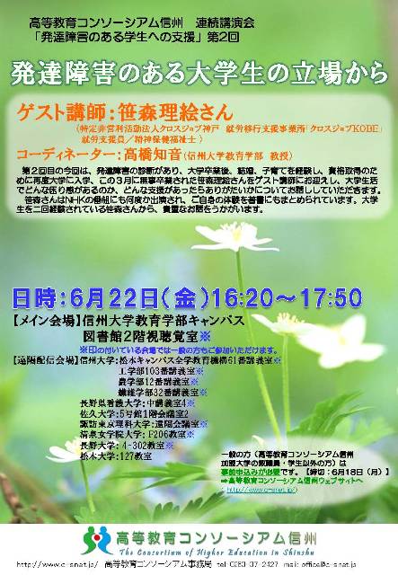 6月22日(金)16時20分より、高等教育コンソーシアム信州主催の連続講演会「発達障害のある学生への支援」の第2回「発達障害のある大学生の立場から」が開催されます。