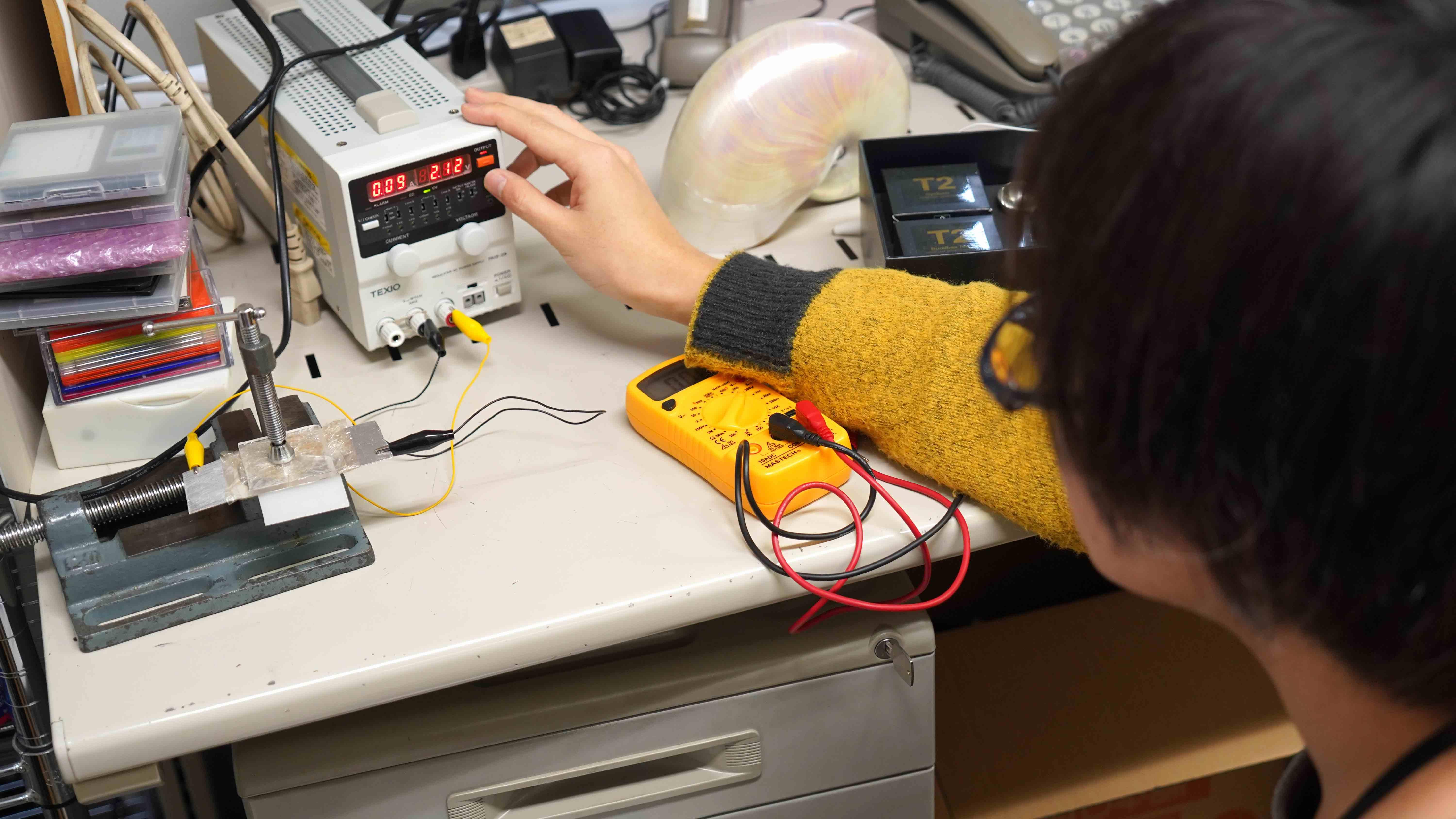 I don't have any particularly difficult situations. I do occasionally come across some challenges. I start teaching this year so I'm half excited and half anxious. Currently, I guide students in graduation research and student experiments, but this is the first time that I teach in a classroom using the blackboard mainly as a method of teaching. Speaking of classes, I made a supercapacitor by hand last year with the first-year students who I was in charge of for the new student seminar. The supercapacitor itself can be made with items found easily around us, so it is also recommended for as a summer project for elementary school students. We the supercapacitors and left them out unused for more than half a year. Will it work? (It took about 1 minute of charging to get the blue LED to light for more than 10 minutes.) The good thing about the supercapacitor is that it can be used semi-permanently unlike Li-ion batteries, and it can be charged at high speeds. It takes less than a minute to fully charge. Therefore, it is not suitable for uses needing long charges. It's a power storage device that's getting a lot of attention right now (it also appeared in the Disney movie Baymax!).