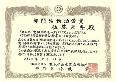 推進動力システム部門 佐藤光秀准教授が電気学会産業応用部門 部門活動功労賞を受賞