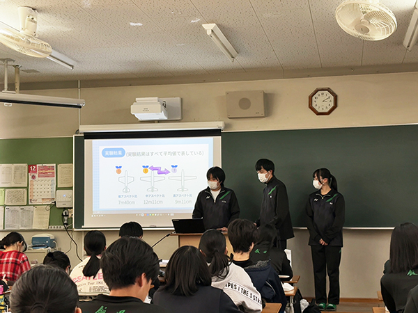最初に信州大学から飛行機が飛ぶ原理と、飛行機の性能に影響するパラメータをいくつか紹介した後、生徒さん達が、比較検討の対象とするパラメータを選定し、それが飛行にどのように影響するかを調べた上で結果を予測、実際に飛行実験を行った結果と比較・考察を行い、その結果を発表する、というものです。