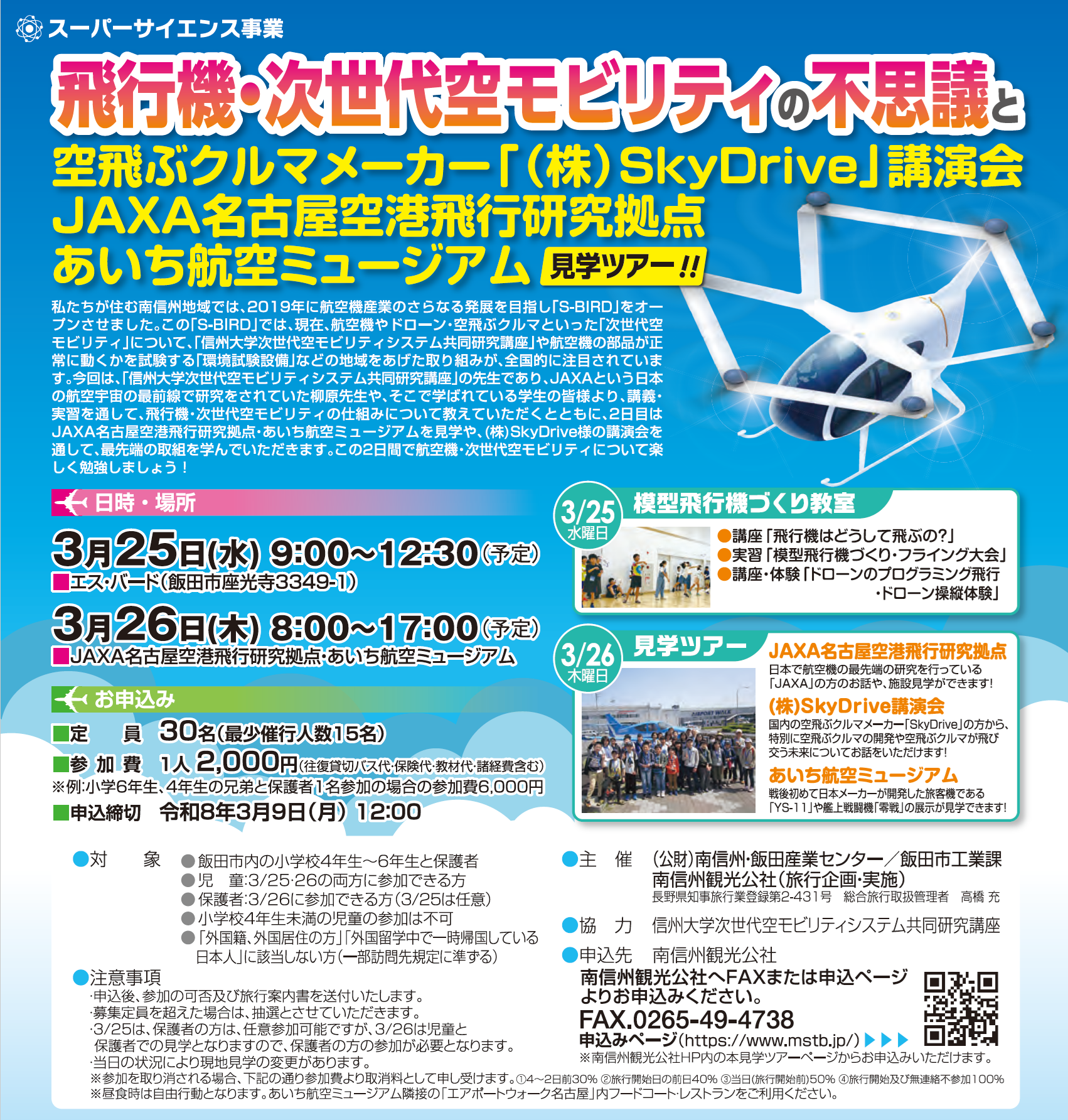 2026年3月25・26日、飯田市工業課主催のスーパーサイエンス特別事業「飛行機・次世代空モビリティの不思議」〈小学4~6年生を対象〉が開催され、小学生12名、保護者10名、計22名の参加がありました。