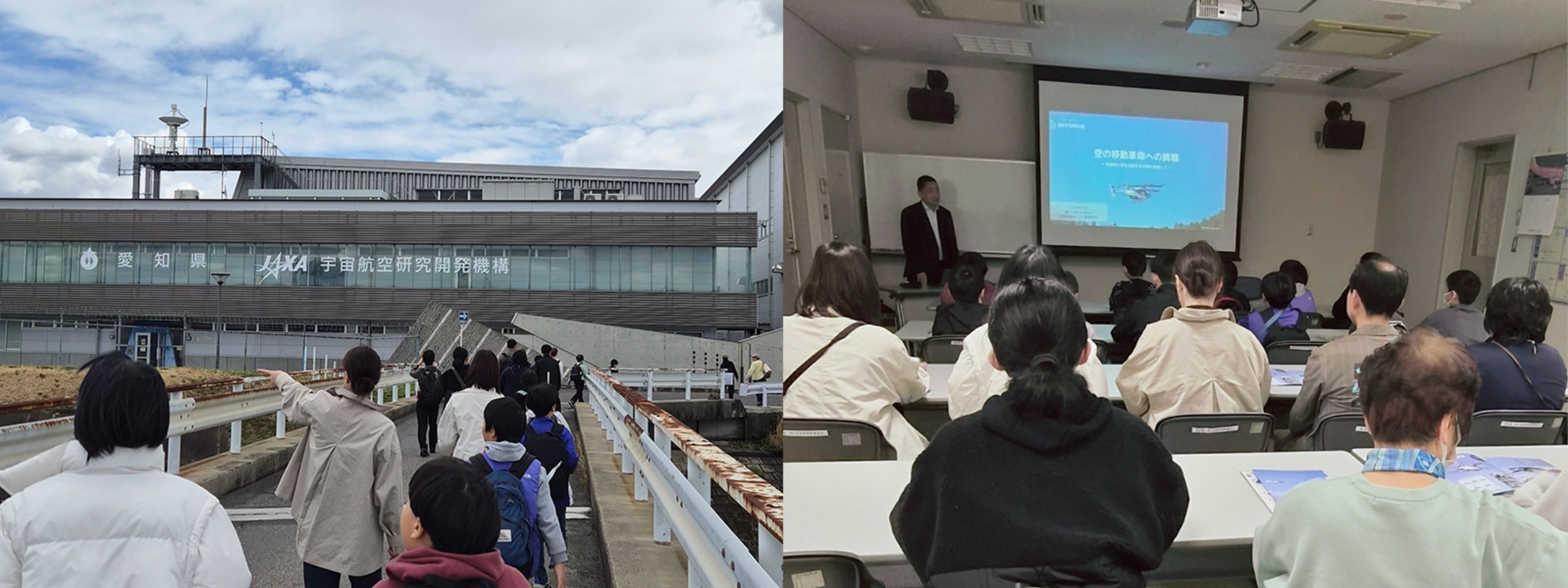 2日目(26日)は、あいち航空ミュージアムとJAXA名古屋空港飛行研究拠点の見学、SkyDrive社の講演会が開催されました。ミュージアムでは過去の錚々たる名機を、JAXAでは最新技術の飛行実証実験に活躍しているジェット実験機を間近に見ることができ,またSkyDrive社の講演会では、100年に一度のモビリティ革命と言われる空飛ぶクルマの開発に直接携わっておられる方から夢のあるお話を聞くことができました。