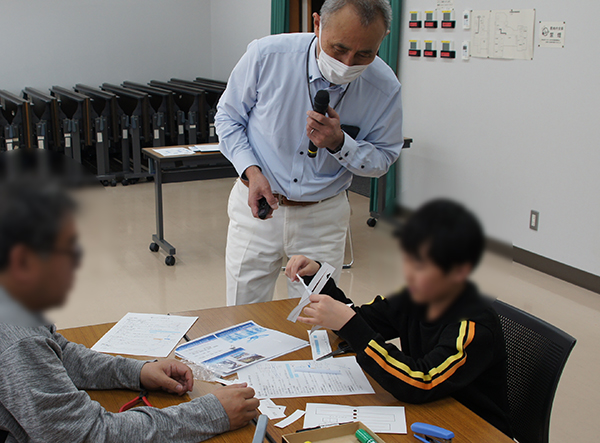 当日は親子4組、合計9名の参加があり、熱心に講義を聞いた後は、和気あいあいと紙コプターの工作に取り組み、全員が完成して、飛ばすことができました。真上に飛ばすとすぐに天井にぶつかってしまうほど、上手にできた紙コプターもありました。