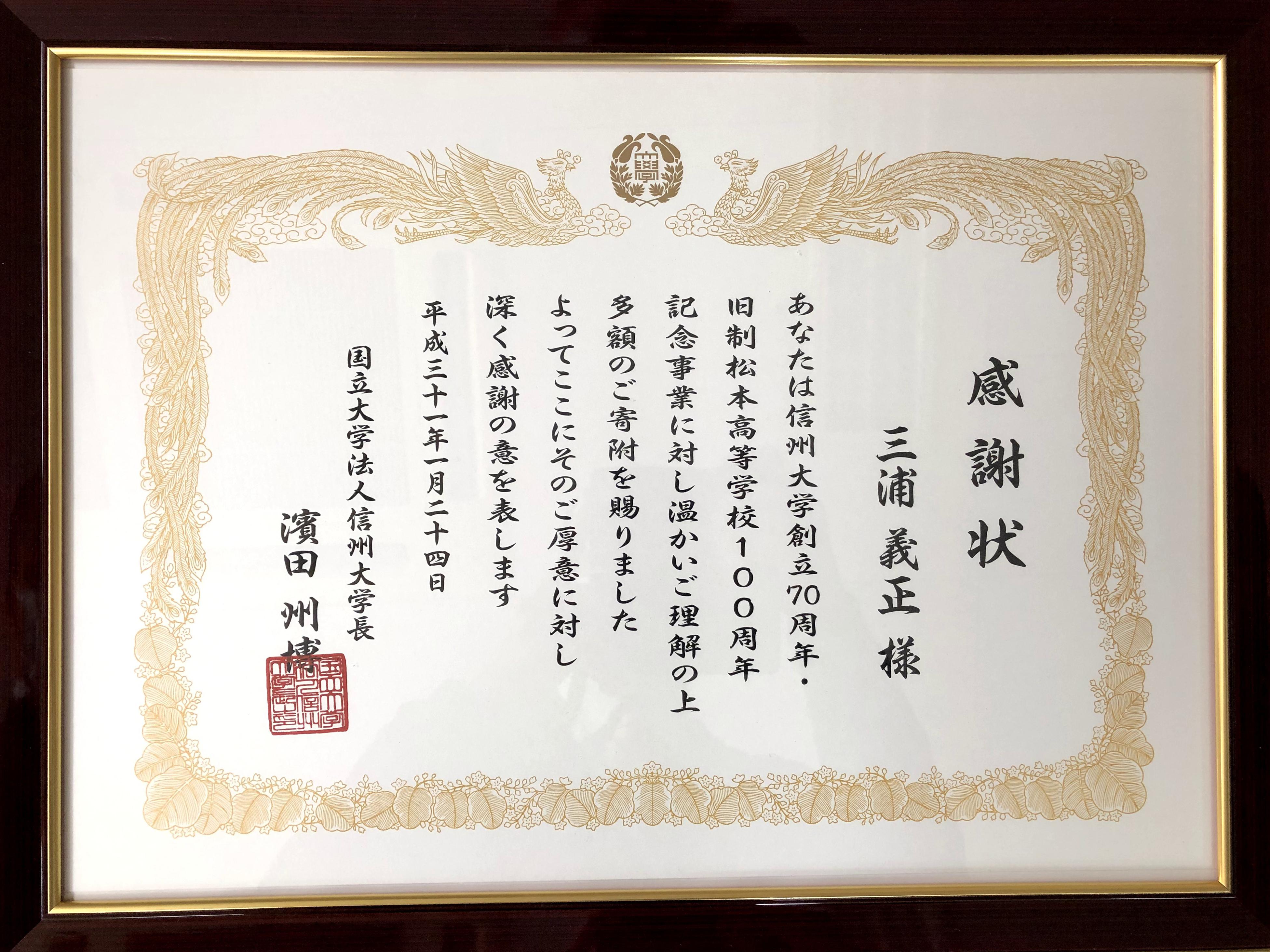 三浦様におかれましては,現在も,長野県プロフェッショナル人材戦略拠点(内閣府・地方創生推進室)拠点マネージャーとして活躍されており,今回の周年記念事業へのご寄附以外に,信州大学知の森基金にも多額のご寄附をいただいております。