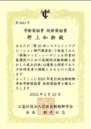 研究 2022年3月24日(木) 大学院総合理工学研究科工学専攻 機械システム工学分野(山﨑研究室・2020年度修了生)の野上和幹さんが計測自動制御学会 学術奨励賞 研究奨励賞を受賞 シェア ツイート LINEで送る メールで送る 印刷する 本賞は、第21回計測自動制御学会システムインテグレーション部門講演会で発表した「移動マニピュレータによる作業対象識別のための長期間活動経験を活かした視点計画」に対して授与されました。 この発表では、対象物を効率的に識別するための視点計画手法を提案し、部屋の片づけの自動化などへ適用できることを示しました。 トピックス一覧に戻る 関連するトピックス 研究 金澤姫さんが根研究学会において優秀発表賞を受賞 2025年12月12日(金) 研究 諏訪竜之介さんが日本土壌肥料学会において優秀発表賞を受賞 2025年12月12日(金) 研究 甲斐健佑さんがCPCR2025で若手研究奨励賞を受賞 2025年12月10日(水)