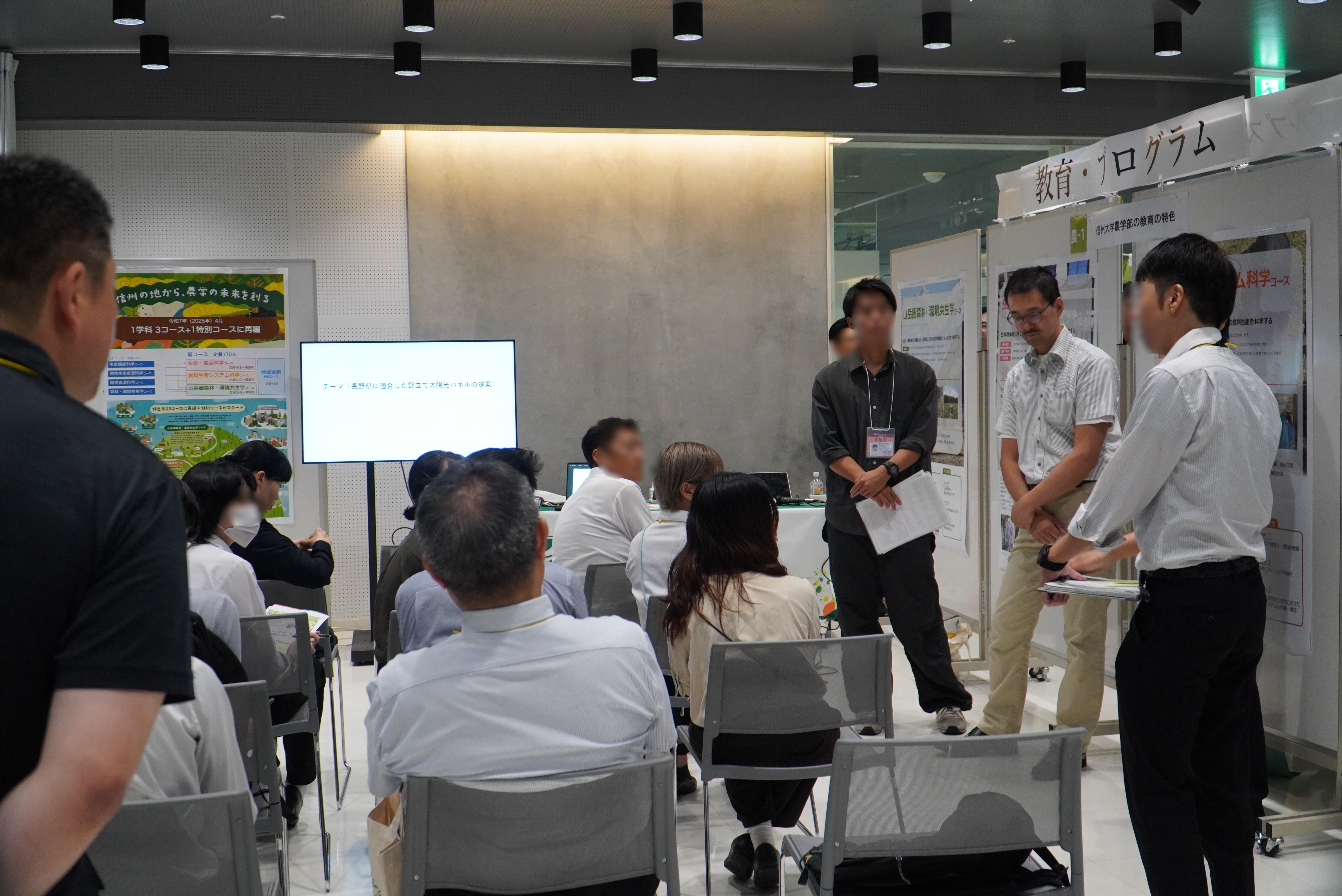 今年度は特設ブースとして、コース改編を行った農学部の新たな取り組みや、信州大学の国際的な活動が紹介され、学生や地域企業の担当者、行政関係者らが熱心に耳を傾ける姿が見られました。