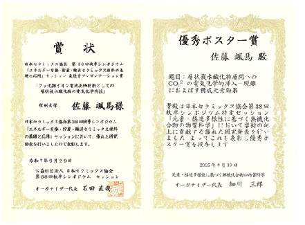 佐藤颯馬さんが日本セラミックス協会第38回秋季シンポジウムにおいて最優秀プレゼンテーション賞および優秀ポスター賞を受賞