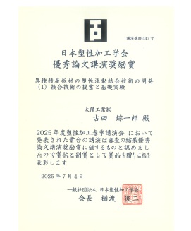 古田綜一郎さんが2025年度塑性加工春季講演会において優秀論文講演奨励賞を受賞