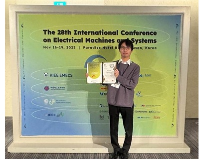 大学院総合理工学研究科 佐藤光秀研究室の中村 貴士さん(修士2年)が2025年11月16日(日)~19日(水)に開催されたThe 28th International Conference on Electrical Machines and Systems(Busan, Korea)において、「BEST PAPER AWARD」を受賞しました。