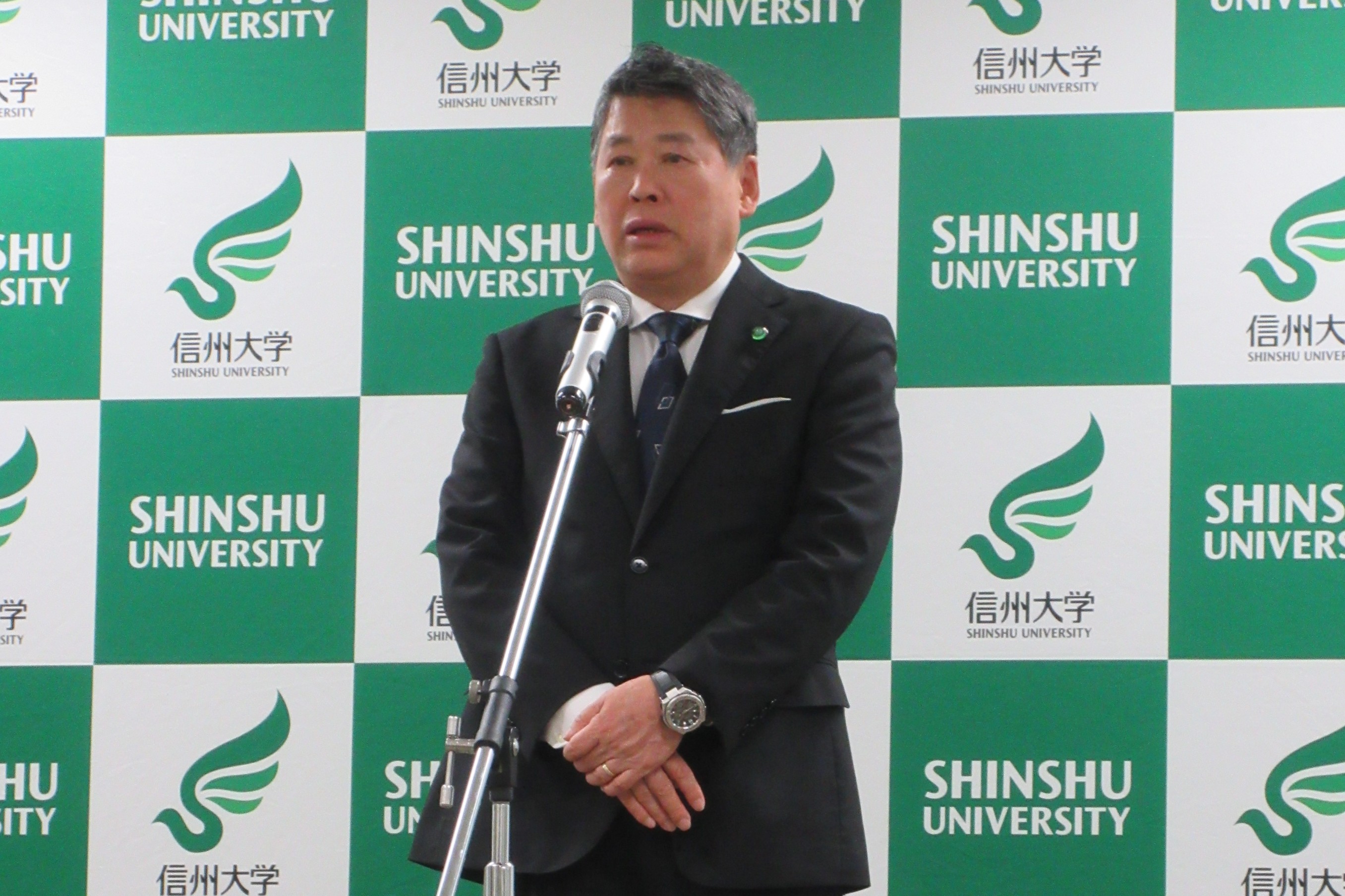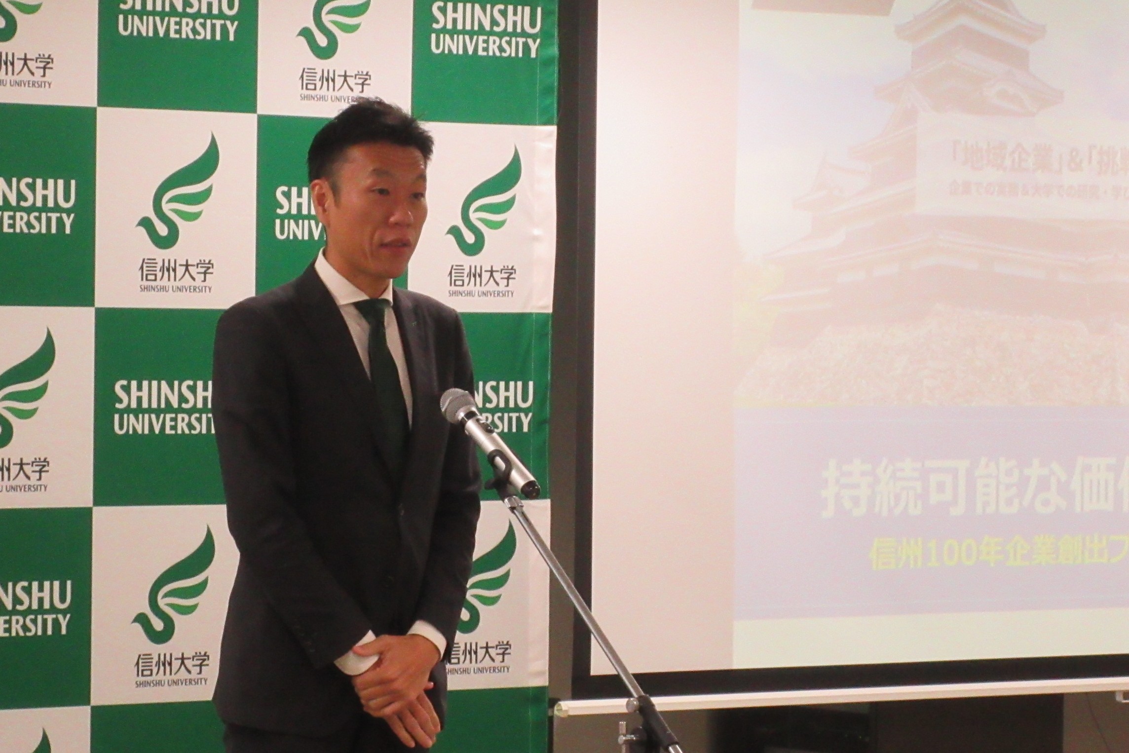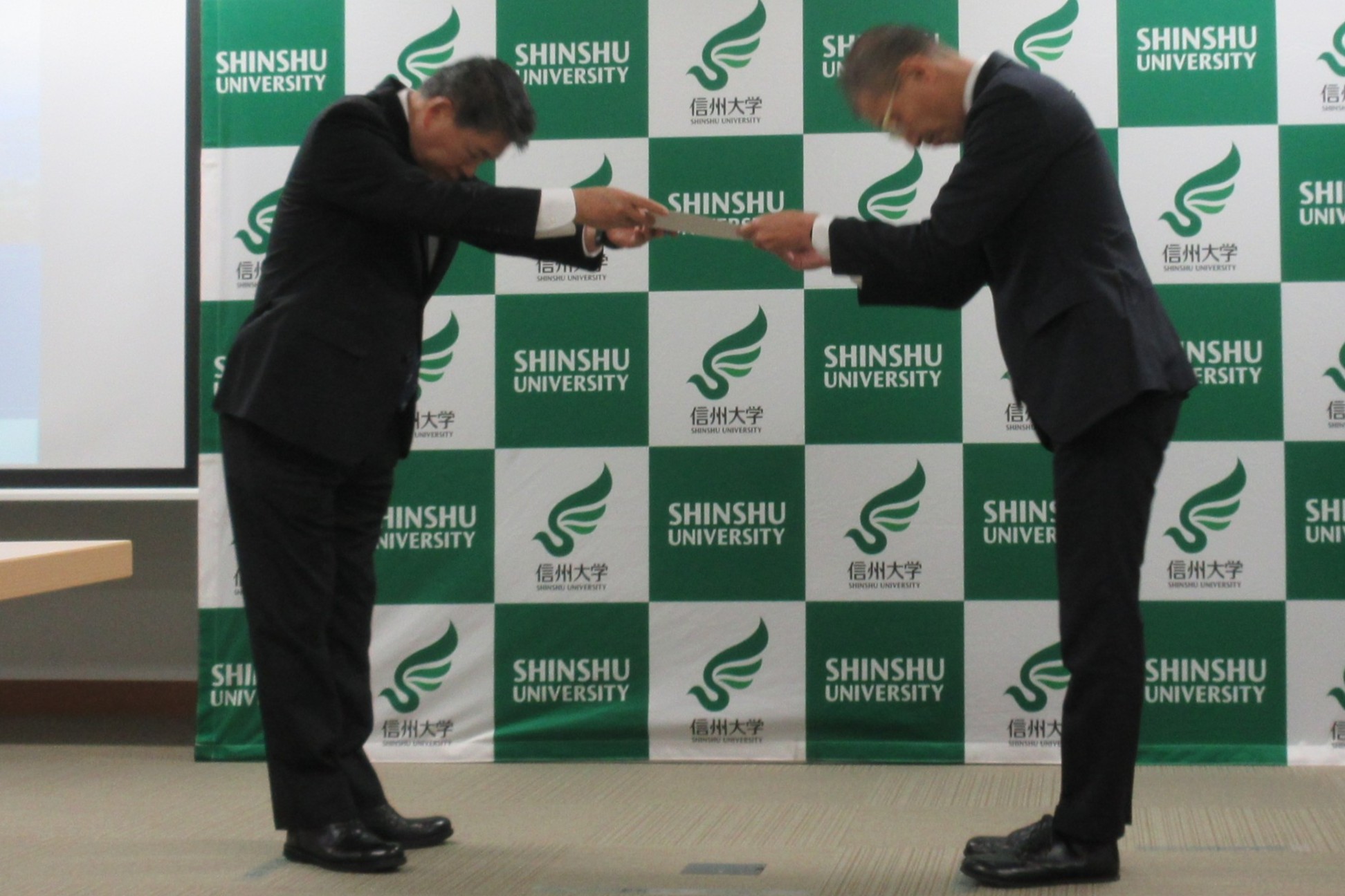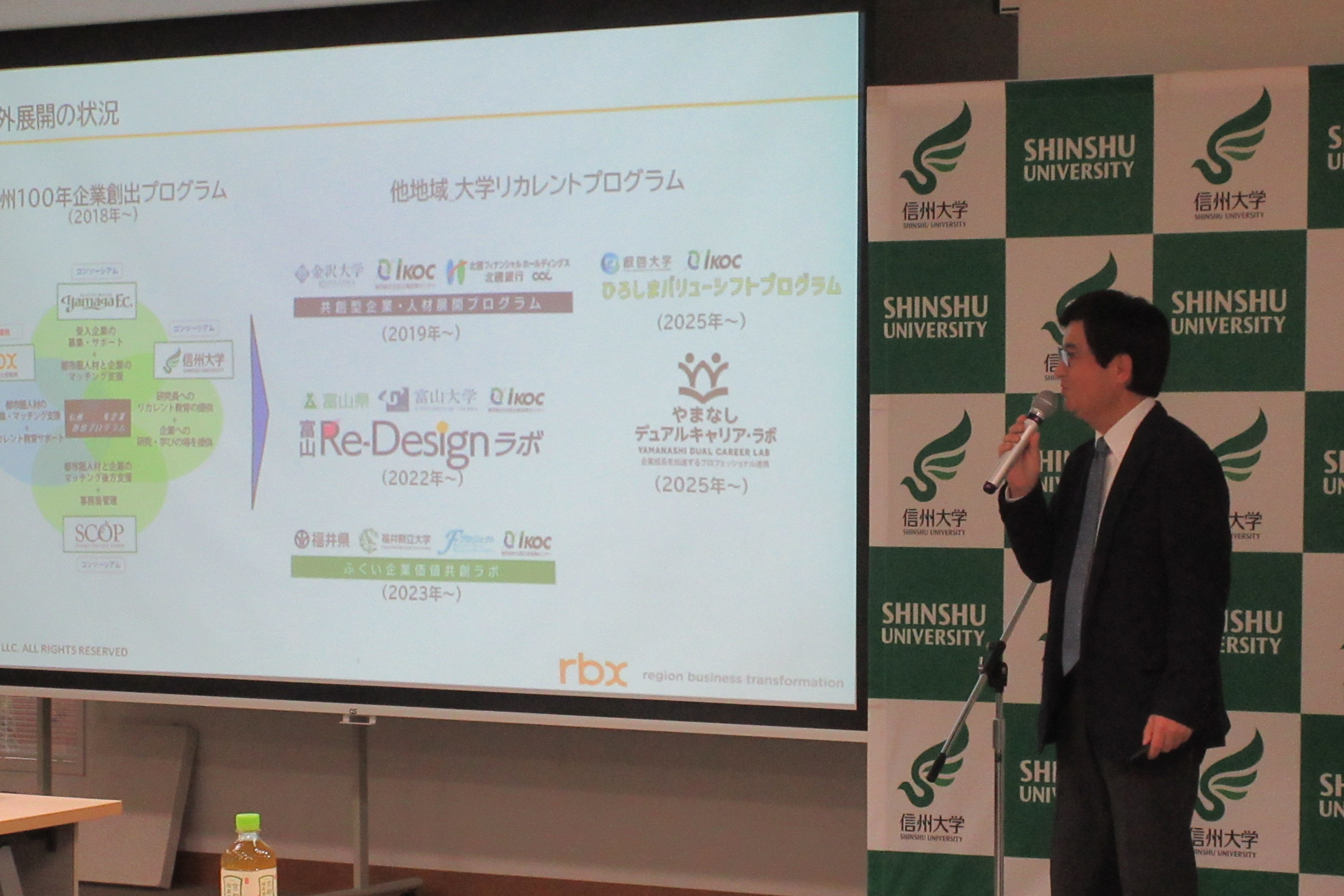 続いて、合同会社RBX 末冨雅之様より本プログラムの県外への展開状況についてお話をいただきました。その後、受入企業様とリサーチ・フェロー(客員研究員)のご紹介をしご挨拶いただき、信州大学 中村宗一郎学長よりリサーチ・フェロー5名へ委嘱状授与と挨拶を行いました。