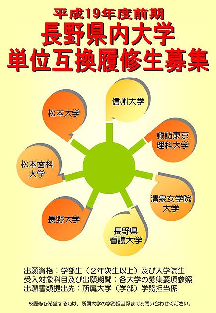 『平成19年度前期・通年信州大学長野県内単位互換履修生募集-本年度から研究科が協定に参加,大学院生も対象になりました』