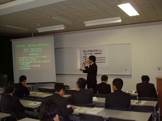 成果発表会には、小宮山学長をはじめ、本教育プロジェクトに関係する企業の役員、学生及び大学関係者約50名の方々が出席し、昨年10月から約3ヶ月間にわたり、地元企業(伊那食品工業株式会社,養命酒製造株式会社)で研修した機能性食料開発学専攻院生の末田さん、古畑さん及び後藤さんが、技術だけでなく、企業活動全体を通して学んだことについて成果発表を行いました。