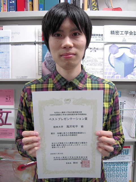 工学部環境機能工学科4年生滝沢旬平さんが、平成21年11月14日に富山大学工学部にて行われた「2009年度精密工学会北陸信越支部学術講演会」において、講演「有機EL素子の薄膜構造最適化による発光色の色調設計」を行い、厳正な審査の結果、優秀と認められ、ベストプレゼンテーション賞を受賞しました。