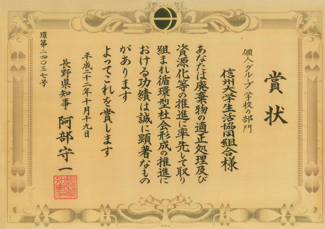 10月19日(火)、長野市の県民文化会館で開かれた「県循環型社会推進大会」にて信州大学生活協同組合が功労者として表彰されました。