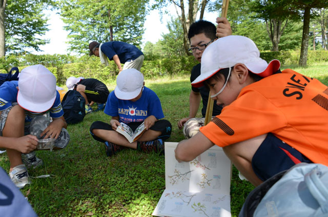 子ども達は、江田助教や学生スタッフの指導の下、虫取り網を使い、昆虫を採集。捕まえた昆虫は、それぞれ図鑑を手に、その種名を調べる「同定」を行ないました。