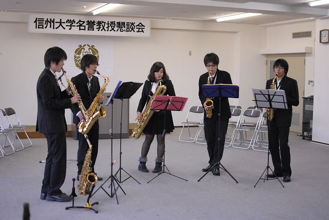 引き続いて、テーブル席に移動し、役員・学部長をはじめとする学内関係者と名誉教授による懇談が和やかな雰囲気の中で行われました。懇談中には、現役学生の元気な姿を見ていただく趣旨で、学生サークル「アンサンブル パインコーン」のメンバー5人による、サックス五重奏の演奏が行われ、会場から温かい拍手が送られました。