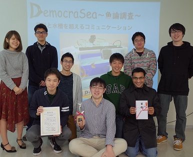 OGIS-RI Software ChallengeAwardは、株式会社オージス総研が2010年から主催する学生向けソフトウェアコンテストであり、毎年異なるテーマが設定されています。今年のテーマは「どうぶつが使えるソフトウェア」でした。学生チームが開発したシステム「DemocraSea~魚論調査~」は魚の気持ちを汲み取るシステムです。住みたい水槽の環境を魚が本能で選ぶ(投票する)というアイデアを実現したものです。