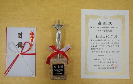 2017年11月15日開催されたOGIS-RI Software Challenge Award2017本選において研究室の学生がゲスト審査員賞を受賞しました。メンバーは、総合理工学研究科 工学専攻 電子情報システム工学分野2年石原義久さん、中村俊輝さん、1年 Narayan Sharmaさん、下林史弥さん、長沼一平さん、工学部 情報工学科 4年瀧澤祥太朗さん、宮下玖留美さん、中村彰吾さん、竹内一希さんのチーム(チーム名:kbylab2017)の9名です。