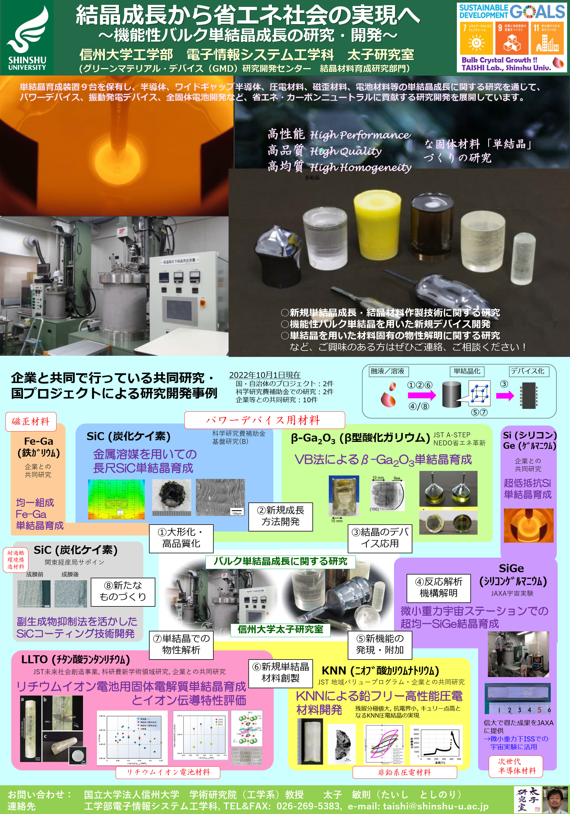 半導体、ワイドギャップ半導体、圧電材料、電池材料、磁歪材料等のバルク単結晶成長に関する研究を行っています。これらの研究を通じて、パワーデバイス、全固体電池、振動発電デバイスなど、省エネやカーボンニュートラルに貢献する研究開発を展開しています。 世の中に存在しない新規の単結晶作製に関する研究、省エネに寄与するバルク単結晶を用いた新規デバイス開発、などご興味のある方はぜひご連絡、ご相談ください。