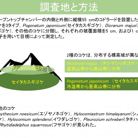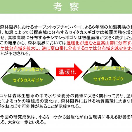 本研究では,地球温暖化の影響を受けやすいとされる森林限界で,温暖化によってコケの種組成がどのように変化するか実験した。オープントップチャンバーによる6年間の加温実験の結果、温暖化が進むと亜高山帯に分布するコケが増加し、その一方、高山帯に分布するコケは大きく減少することを明らかにした。温暖化によって山岳に生育するコケの種組成は大きく変化し、森林の多面的・公益的機能にも影響を及ぼす可能性が示唆された。