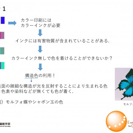 カラープリンターに用いる着色剤は重金属や色素を含んでおり、環境に負荷を与える可能性があります。私達は着色剤やカラーインクを使わずに構造色により紙に色を着ける新しい技術を開発しました。この技術をより使いやすいものにすることで『カラーインクを使わないカラー印刷』を社会実装すべく研究を進めています。