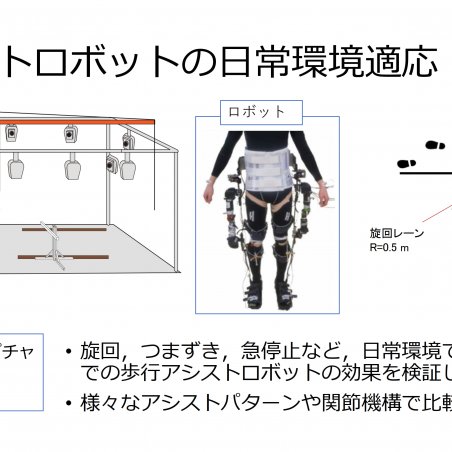 ロボットには、人間の動作を邪魔せずに人間の意図通りに動くことが求められます。人間との動作の不整合は、安全性と利便性を損ないます。そのような不整合発生状況の再現、解析技術を展示します。また、そうした状況を解決するために開発している様々なデバイスを展示します。