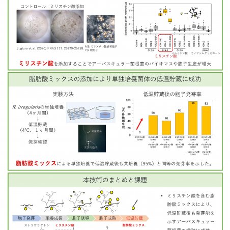 アーバスキュラー菌根菌(AM菌)は作物の養分吸収を助ける共生微生物です。AM菌は、微生物資材として販売され農業生産に利用されていますが、その製造には植物に接種し増殖する必要があります。私達は、AM菌に脂肪酸を投与することで、AM菌の純粋培養を可能としました。一方で、低温貯蔵で胞子の発芽活性が失われることが課題でしたが、この問題を脂肪酸の混合添加で解決しました。