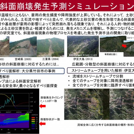 信州には,急峻な山岳地帯や活火山,中央構造線沿いの脆弱な地質帯があり,土砂災害の多発地域と言えます。そのような土砂災害を極力軽減することを目的に研究を行っています。豪雨による斜面崩壊,融雪型火山泥流,氷河湖決壊洪水の発生メカニズムの解明し,その予測を目指しています。また,土砂災害の防止・軽減や総合的土砂管理のために必要な河川の土砂移動計測の手法を開発しています。