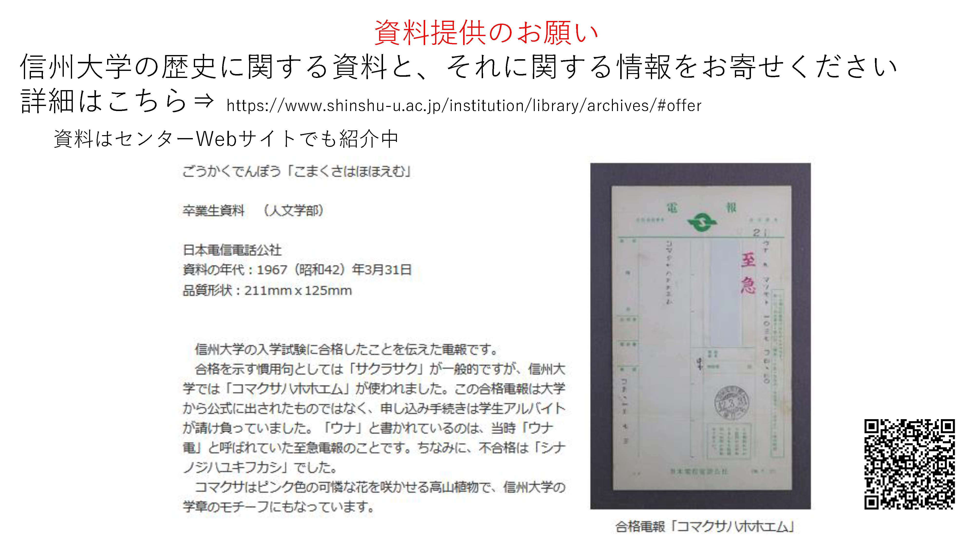 信州大学大学史資料センターは、地域・自治体とも連携して、史資料の体系的収集と整理保存、調査研究、展示公開、またそれらに取り組む人材養成への協力等をとおし、信州大学と地域に係る重要な資料を後世に伝える取組を行っています。今後、さらに学内外の連携によりデジタルアーカイブ等の取り組みも進めていく予定です。
