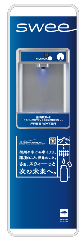 「swee」は信州大学の手嶋・林・山田研究室が開発し、特許、商標も取得した高機能な無機結晶材料「信大クリスタル(※1)」を搭載した無料の浄水設備で、2021年から長野県内で設置が始まりました。「信大クリスタル」は水に溶け込むことがある金属イオンなどを除去する機能があり、マイボトルを持参すれば、信州の安全で美味しい水を外出先で気軽に飲むことができます。