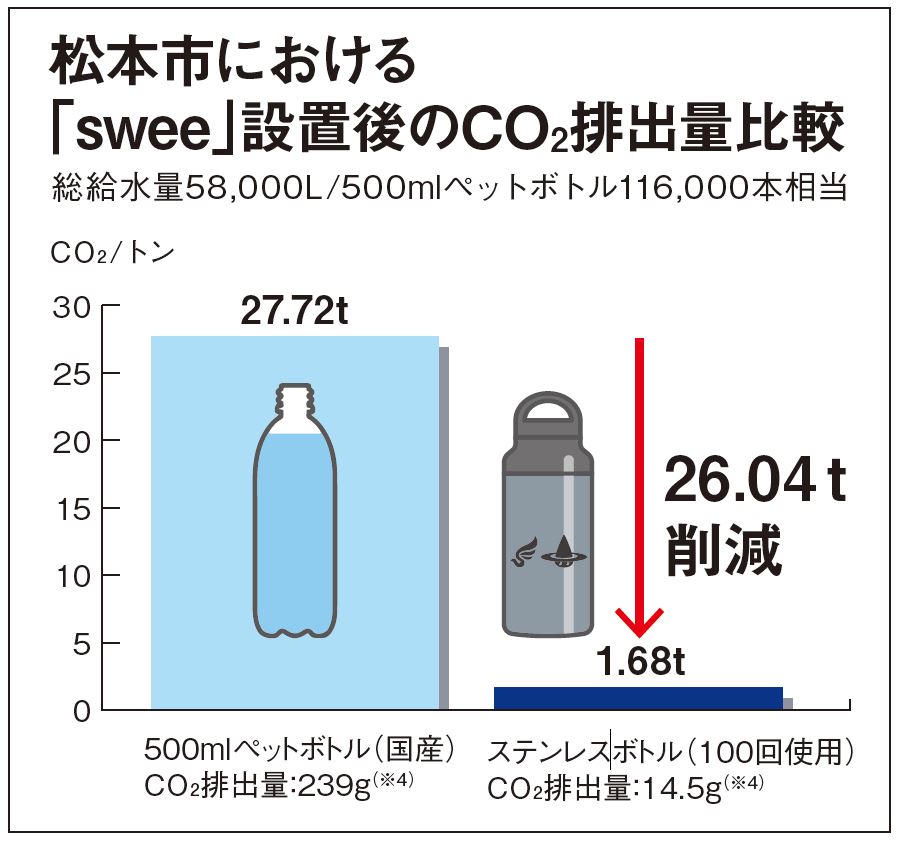 「swee」の設置により松本市ではこの2年間で約11万6,000本のペットボトルを削減しました。