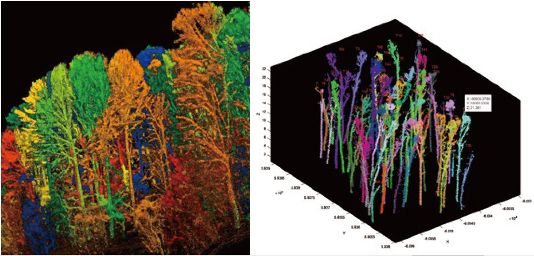 レーザー計測はとにかく多機能。樹木の種類や本数、樹高はもちろん、単木樹冠抽出やラベリングも自動。
