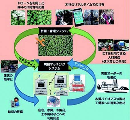 信州大学山岳科学研究拠点の加藤正人教授(農学系)が航空機やドローン、地上のタブレット端末からのレーザーセンシング情報をかけ合わせた独自のICT統合技術を開発、1本1本の樹木まで3次元で映像解析できるため、必要とする樹木を伐採することができ、伐採の現場から流通まで一貫したビジネスを可能にしました。さらにAI技術で、国内初となる苗木の自動抽出と高額で取り引きされる広葉樹の種類までの特定が可能になりました。現在このビジネスはコンソーシアムが組まれ森林組合や計測会社が参画、県・森林管理局などが協力支援しています。