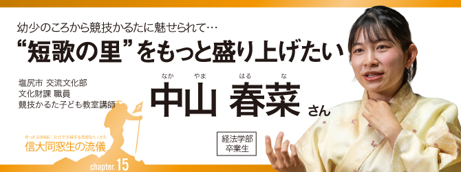志を持っていきいきと活躍する信大同窓生を描くシリーズの第15回で登場いただくのは、塩尻市 交流文化部 文化財課 職員の中山春菜さん(経法学部卒業生)。幼少期から競技かるたをこよなく愛してきた中山さんは、“短歌の里”と呼ばれる長野県塩尻市で、市役所職員として短歌文化の普及や地域づくり・人づくりを目的に、子ども向け競技かるた教室を開催し、講師を務めています。教室を開催している市の施設、塩尻短歌館でその活動内容や競技かるたに対する溢れる想いをお聞きしました。(文・佐々木 政史)